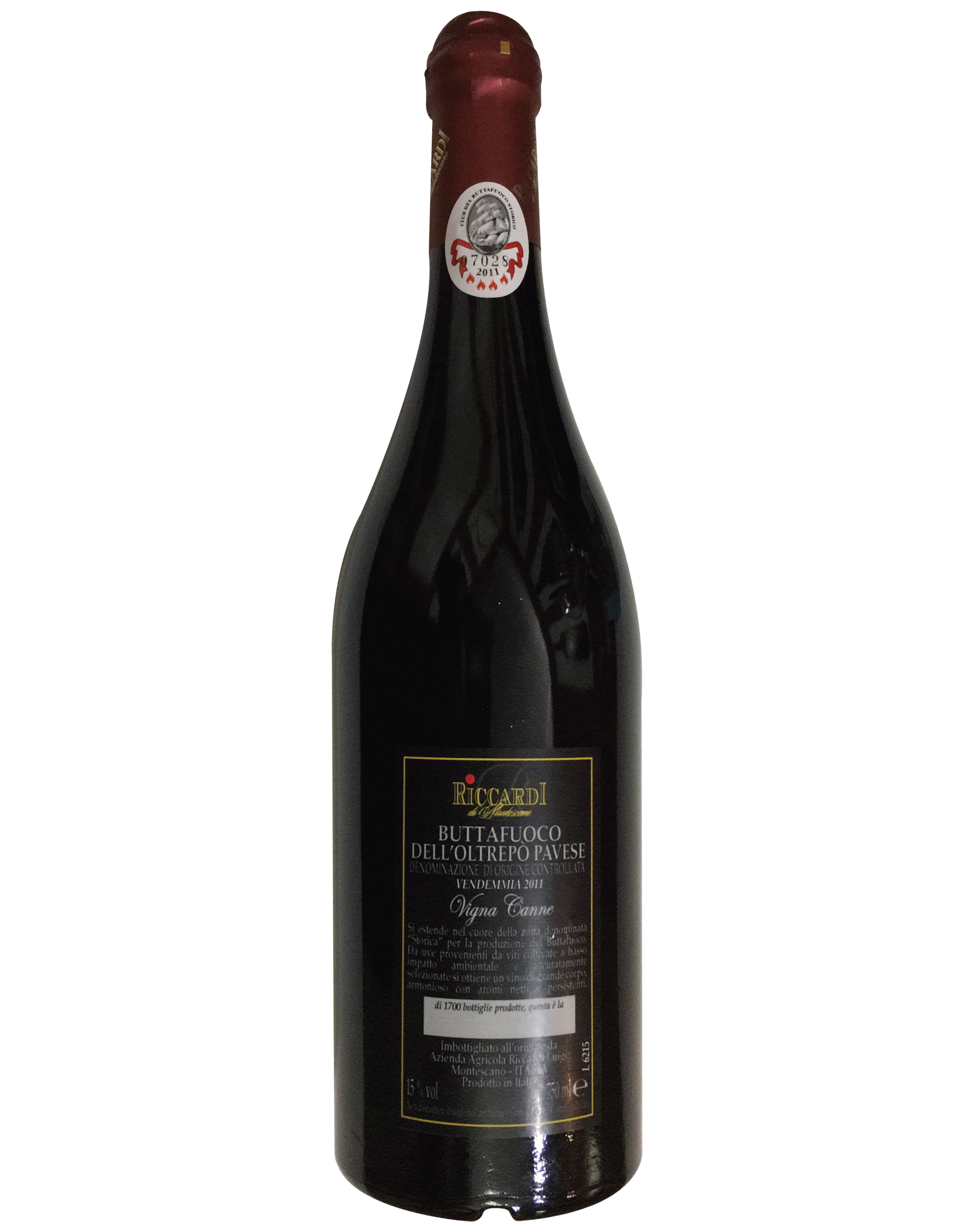 The blend of historic Buttafuoco is as follows: 50% Croatina that brings the polyphenolic structure, color and hints of red fruit; 25% Barbera form with its acidity the backbone of the wine and allows greater extraction from the pomace of Croatina; Finally, for the remaining part Ughetta Canneto and Uva Rara that enrich this wine with notes of elegance and pleasant austerity.